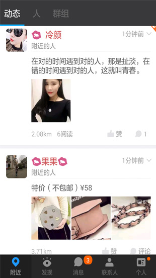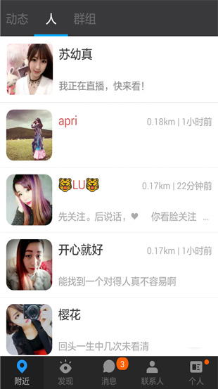 該軟件是 Android 平臺(tái)下的聊天客戶端,用戶可以通過(guò)該軟件查看附近的用戶,通過(guò)點(diǎn)擊用戶的頭像可以查看用戶的個(gè)人介紹,根據(jù)自己的意愿可以添加該用戶為好友,然后可以和該用戶進(jìn)行聊天;用戶也可以把自己喜歡的美食和心情分享到動(dòng)態(tài),好友可以通過(guò)自己客戶端可以查看到用戶的動(dòng)態(tài)。