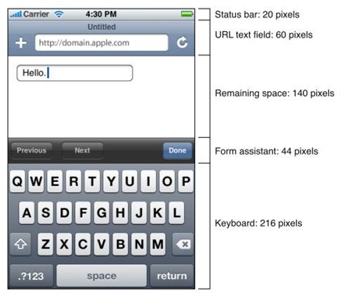 當(dāng)沒有鍵盤和表單輔助按鈕時(shí),會(huì)多出216像素的垂直空間來展示網(wǎng)頁(yè)。在橫屏模式下,值有兩處不同,鍵盤高162像素,表單輔助按鈕高32像素。