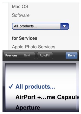 設(shè)計(jì)了新的下拉菜單控件。在電腦版Safari上,下拉菜單的表現(xiàn)方式與Mac系統(tǒng)中的應(yīng)用程序一致,菜單打開,展示所有的項(xiàng)目,甚至在必要的時(shí)候超過窗口邊緣。iOS版Safari,下拉菜單采用新的樣式,提供更好的用戶體驗(yàn)。例如,在iPhone上,下拉菜單顯示在一個(gè)拾取器里。