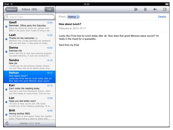 雖然iPad版Mail的用戶體驗(yàn)是為該設(shè)備量身定做的,但它沒有改變用戶使用的核心功能,也沒有改變某個(gè)功能的位置或是效果。iPhone版Mail用戶很容易發(fā)現(xiàn)iPad版工具欄上的項(xiàng)目以及收件箱結(jié)構(gòu),也因兩者不變的本質(zhì)而立刻懂得如何使用它。
