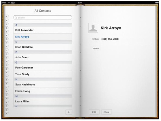 合適的時候,給你的程序增加一些真實(shí)感。通常,程序的外觀和行為與真實(shí)生活越相近,用戶越容易理解如何使用它,也越喜歡用它。例如,用戶立刻明白如何使用iPad版Contact上的地址簿。