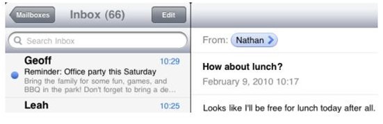 例如,iPhone版Mail在瀏覽郵件頁面的工具欄上放置了刷新,管理,刪除,回復(fù)和書寫。