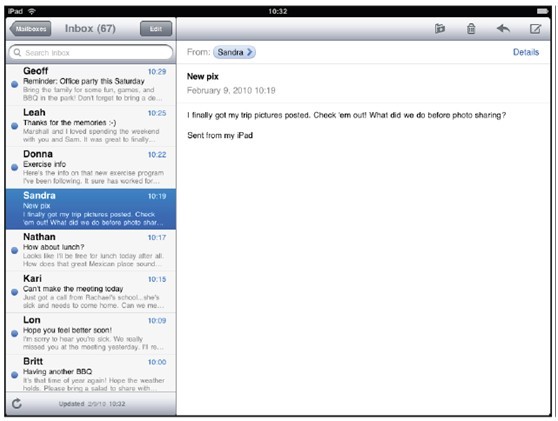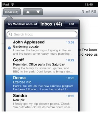iPad版Mail在郵件上方的工具欄提供了其中四個按鈕。刷新按鈕移到了郵件箱列表。