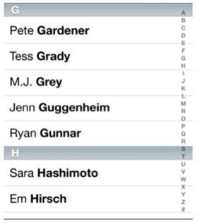 展示有編號(hào)欄的信息。樸素型樣式支持編號(hào),可以讓用戶快速找到需要的信息。編號(hào)通常是貼在屏幕右邊緣的一欄字符,通常是按字母表排序的字母。用戶觸摸(或拖拽)編號(hào),展示相關(guān)的區(qū)域。