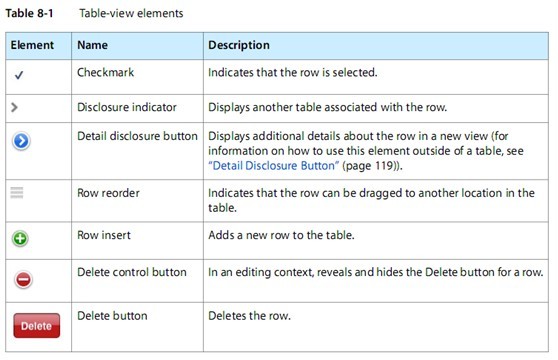 iOS提供了一些表格元素,用于拓展表格的功能。除非特別標(biāo)注,這些元素僅適用于表格視圖。