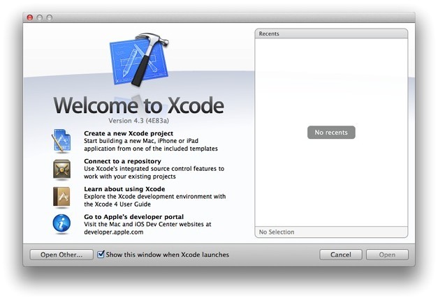 如果從未在 Xcode 中創(chuàng)建或打開過項(xiàng)目,你應(yīng)該會看到一個(gè)與下圖類似的“Welcome to Xcode”窗口: