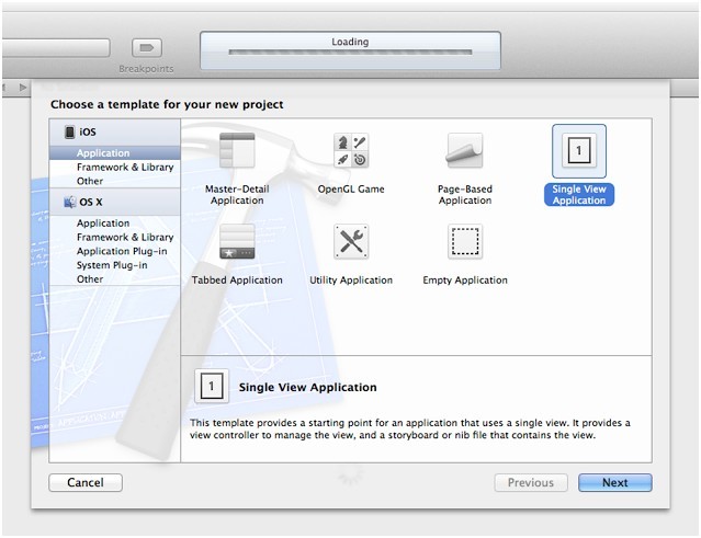 Xcode 將打開一個(gè)新窗口并顯示對話框,讓你從中選取一個(gè)模板。Xcode 內(nèi)建了一些應(yīng)用程序模板,你可以使用這些模板來開發(fā)常見類型的 iOS 應(yīng)用程序。例如“Tabbed”模板可以創(chuàng)建與 iTunes 類似的應(yīng)用程序,“Master-Detail”模板可以創(chuàng)建與“郵件”類似的應(yīng)用程序。