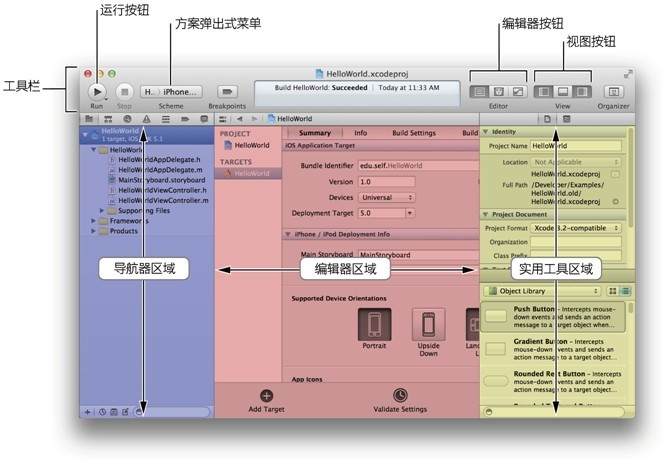 請花一些時(shí)間來熟悉 Xcode 的工作區(qū)窗口。在接下來的整個(gè)教程中,你將會用到下面窗口中標(biāo)識出的按鈕和區(qū)域。