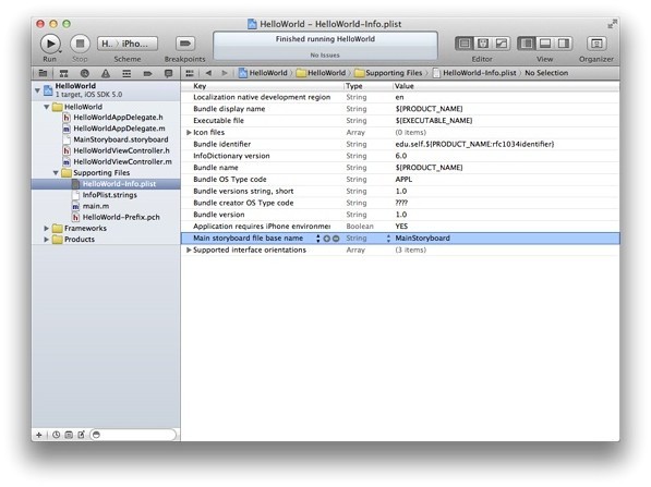 ·在項目導(dǎo)航器的“Supporting Files”文件夾中,選擇 HelloWorld-Info.plist。