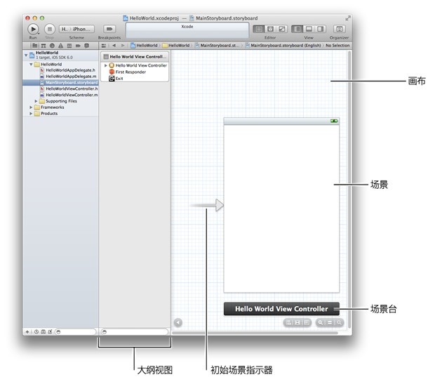 畫布上,場景下方的區(qū)域稱為場景臺,F(xiàn)在,場景臺顯示了視圖控制器的名稱,即“Hello World View Controller”。其他時候,場景臺可包含圖標(biāo),分別代表第一響應(yīng)器、Exit 占位符對象和視圖控制器對象。