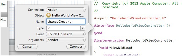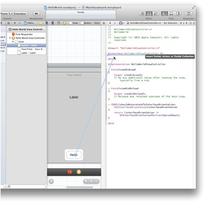 按住 Control 鍵將"Hello"按鈕拖移到 HelloWorldViewController.m 文件中的類擴展,并配置生成的操作后,你完成了兩件事情:通過 Xcode 將合適的代碼添加到了視圖控制器類中(在 HelloWorldViewController.m 中),并在按鈕和視圖控制器之間創(chuàng)建了連接。具體來說,Xcode 做了以下事情: