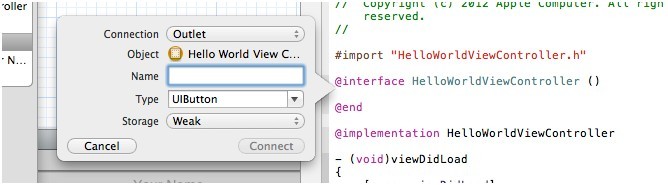 注:如果在 HelloWorldViewController.m 類擴展區(qū)域以外的其他地方松開 Control 鍵并停止拖移,可能會看到不同類型的彈出式窗口,或者是什么都沒有。如果出現(xiàn)這種情況,請在畫布上的視圖內(nèi)部點按來關(guān)閉彈出式窗口(如有需要),并再試一次按住 Control 鍵拖移。
