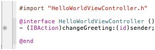 ·在 HelloWorldViewController.m 中,將以下操作方法聲明添加到了類擴展: