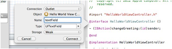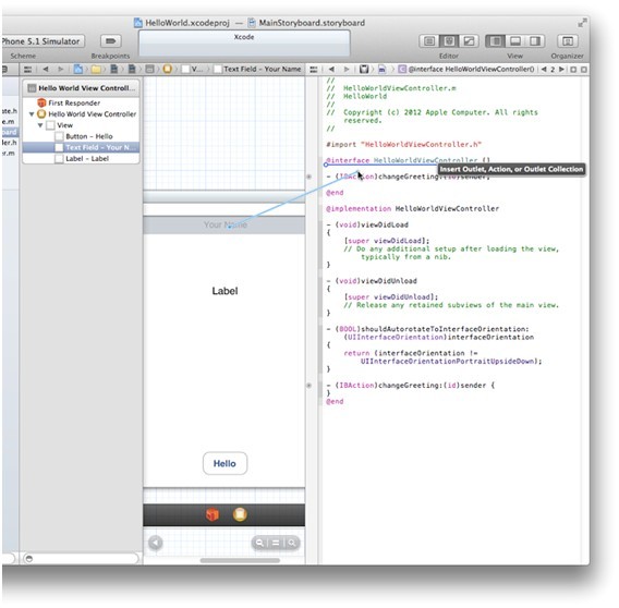 為文本欄和標(biāo)簽添加 outlet 的步驟與添加按鈕操作的步驟非常相似。開(kāi)始之前,請(qǐng)確定主串聯(lián)圖文件仍然顯示在畫布上,而 HelloWorldViewController.m 在輔助編輯器中保持打開(kāi)。