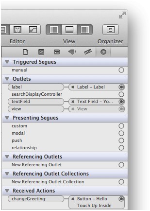 你可以在"Connections"檢查器中驗(yàn)證這些連接,為視圖控制器打開(kāi)"Connections"檢查器的具體方法如下: