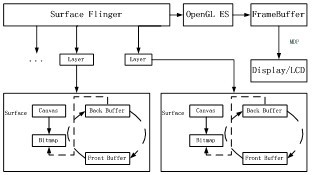 每個Surface對應(yīng)一個層(Layer)對象,Surface Flinger負(fù)責(zé)將各個層對象的前端緩沖組合并渲染到屏幕上。