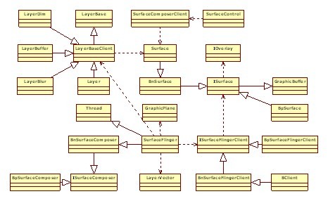圖-2從依賴關(guān)系層面詳細(xì)地展現(xiàn)了Surface、Layer、Surface Flinger的關(guān)系。
