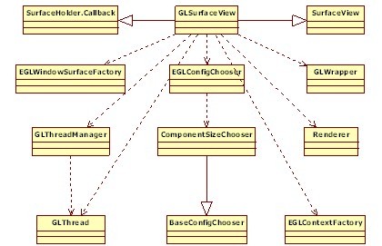 由于3D和2D的渲染機(jī)制有所不同,所以Android通過(guò)對(duì)SurfaceView的繼承,創(chuàng)立了專用于3D渲染的GLSurfaceView。GLSurfaceView調(diào)用自定義的渲染器可以在特定的Surface上進(jìn)行OpenGL ES的渲染,同時(shí)GLSurfaceView還實(shí)現(xiàn)了SurfaceHolder.Callback接口,可以監(jiān)聽(tīng)到Surface狀態(tài)變化的消息。下圖顯示了GLSurfaceView的類(lèi)圖。