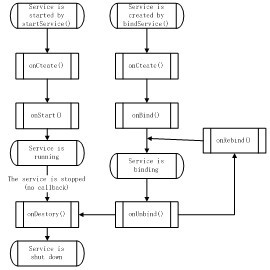 當(dāng)客戶端需要和服務(wù)進(jìn)行綁定來利用服務(wù)時(shí),需要調(diào)用Context.bindService()方法,結(jié)束綁定需要調(diào)用Context.unbindService()方法。圖1-2顯示了服務(wù)的狀態(tài)遷移過程。