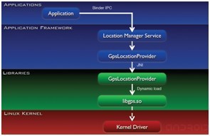 如圖1-2所示為智能手機(jī)中常見(jiàn)的位置服務(wù)的調(diào)用層次說(shuō)明,上層的導(dǎo)航應(yīng)用和其他的位置應(yīng)用在獲取底層的GPS服務(wù)時(shí),首先調(diào)用位置管理器服務(wù)(Location Manager Service),然后通過(guò)Java JNI終調(diào)用libgps.so共享庫(kù)。