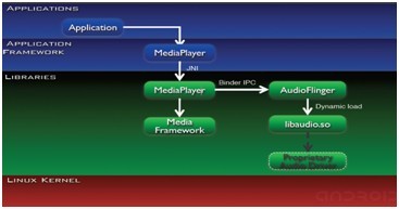 在原生服務(wù)調(diào)用模式中,由于應(yīng)用本身更加復(fù)雜,應(yīng)用的抽象實(shí)現(xiàn)會(huì)放置在原生層,當(dāng)上層應(yīng)用調(diào)用底層的服務(wù)時(shí),首選會(huì)通過(guò)Java JNI調(diào)用應(yīng)用本身的原生接口,然后通過(guò)IPC通信與其他的原生服務(wù)進(jìn)行交互。如圖1-3所示為媒體播放應(yīng)用的調(diào)用層次關(guān)系。