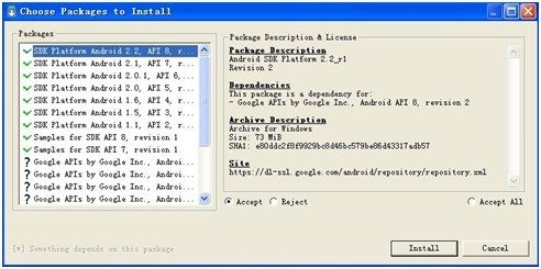 JDK和Eclipse安裝成功后,下載安裝Android的SDK,得到android-sdk-windows.zip,解壓后運(yùn)行SDK Manager.exe,選擇需要的API版本進(jìn)行安裝,如圖1-3所示。