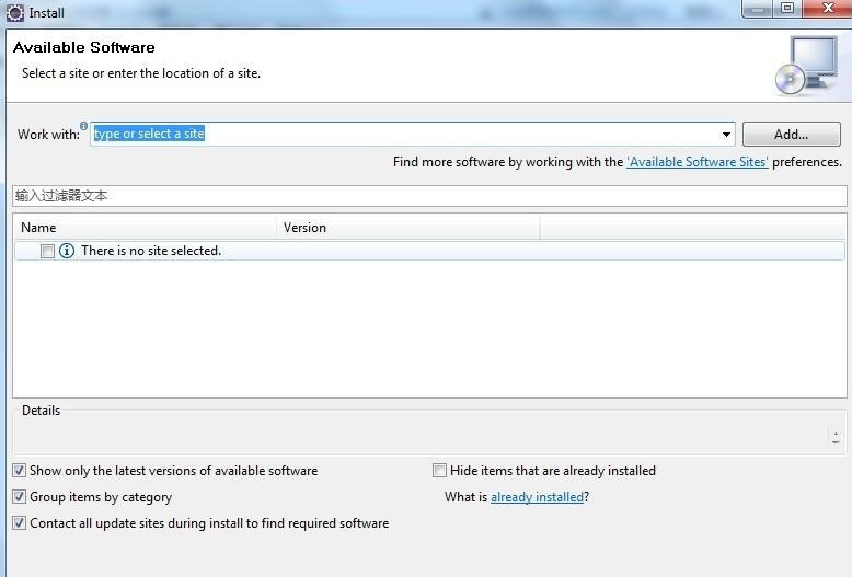 在Eclipse中安裝ADT,首先在啟動Eclipse,選擇"Help"→"Software Updates"命令,準(zhǔn)備安裝插件。在彈出的對話框中選擇"Available Software",得到如圖1-4所示界面。