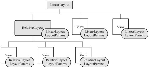 如圖-3所示,這些 Layout 可以套疊式地組成一棵視圖樹。其中,父節(jié)點(diǎn)的 Layout 與子節(jié)點(diǎn)的 LayoutParams之間有控制關(guān)系,例如,若父節(jié)點(diǎn)是RelativeLayout,則子節(jié)點(diǎn)的單元中可以指定RelativeLayout.LayoutParams 中的屬性,以控制子節(jié)點(diǎn)在父節(jié)點(diǎn)中的排列狀況。