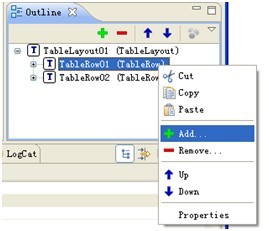 (3)通過Outline,向TableRow01中添加TextView和EditText;向TableRow02中添加兩個Button。