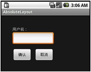 絕對布局是一種不推薦使用的界面布局,因為通過X軸和Y軸確定界面元素位置后,Android系統(tǒng)不能夠根據不同屏幕對界面元素的位置進行調整,降低了界面布局對不同類型和尺寸屏幕的適應能力。每一個界面控件都必須指定坐標(X,Y),例如圖5-12中,“確認”按鈕的坐標是(40,120),“取消”按鈕的坐標是(120,120)。坐標原點(0,0)在屏幕的左上角。