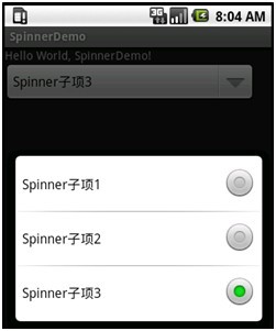 程序包含3個(gè)子項(xiàng),Spinner控件在XML文件中的代碼如代碼清單1所示。