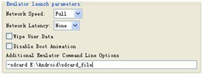 如果希望Android模擬器啟動時能夠自動加載指定的SD卡,還需要在模擬器的“運行設置”(Run Configurations)中添加SD卡加載命令,而SD卡加載命令中只要指明映像文件位置即可。SD卡加載命令如圖7-4所示。