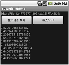 在圖7-6所示界面中,通過“生產(chǎn)隨機數(shù)列”按鈕生產(chǎn)10個隨機小數(shù);通過“寫入SD卡”按鈕將生產(chǎn)的數(shù)據(jù)保存在SD卡的目錄下。SDcardFileDemo示例運行后,在每次單擊“寫入SD卡”按鈕后,都會在SD卡中生產(chǎn)一個新文件,文件名各不相同。