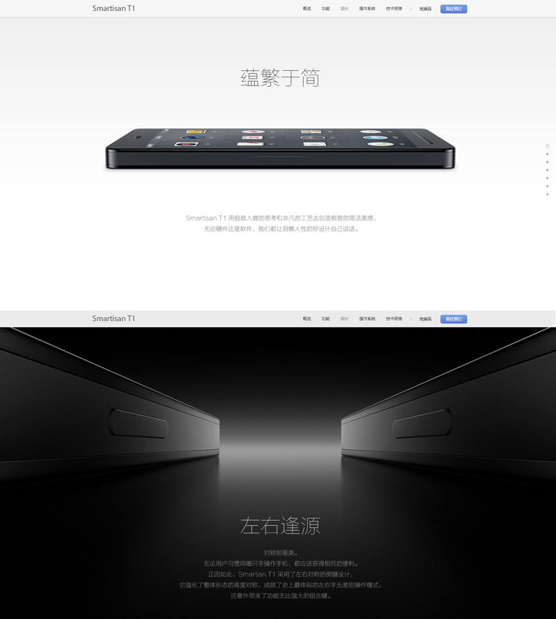 這是錘子T1的頁(yè)面設(shè)計(jì),雖然好多人都不喜歡老羅,但是我覺(jué)得他有對(duì)設(shè)計(jì)特有的一種完美主義的偏執(zhí),無(wú)論是手機(jī)的外型(各種對(duì)稱(chēng))還是系統(tǒng)UI的設(shè)計(jì),我覺(jué)得作為設(shè)計(jì)師我還應(yīng)該多向他學(xué)習(xí)一下;氐巾(yè)面設(shè)計(jì)本身,我們來(lái)分析一下這個(gè)頁(yè)面的設(shè)計(jì)。