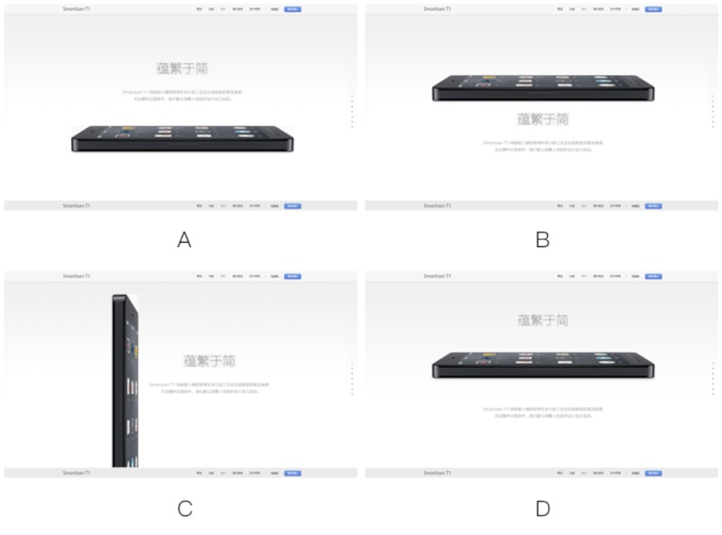 上面圖A、B、C是對(duì)頁(yè)面重新排版,圖D是原有的設(shè)計(jì)。雖然總體看起來(lái)都還可以,但是我們?nèi)匀豢梢院苤庇^的看出來(lái),圖A的構(gòu)圖有些頭重腳輕,讓人感覺(jué)中心偏下;圖B的手機(jī)主體物有種對(duì)文案的擠壓感,讓人覺(jué)得壓抑;圖C的手機(jī)和文案成為90°的夾角,讓人覺(jué)得有種阻礙感,不順滑;圖D的設(shè)計(jì)很好的協(xié)調(diào)了主體圖與文案的關(guān)系,并且給人一種從遠(yuǎn)及近的中距離縱深感。整個(gè)畫(huà)面中間對(duì)齊更能大限度的突出主體——手機(jī)。從錘子的網(wǎng)頁(yè)設(shè)計(jì)中我們可以觀察到,這種排版方式是中間對(duì)齊,無(wú)論是橫向還是豎向。