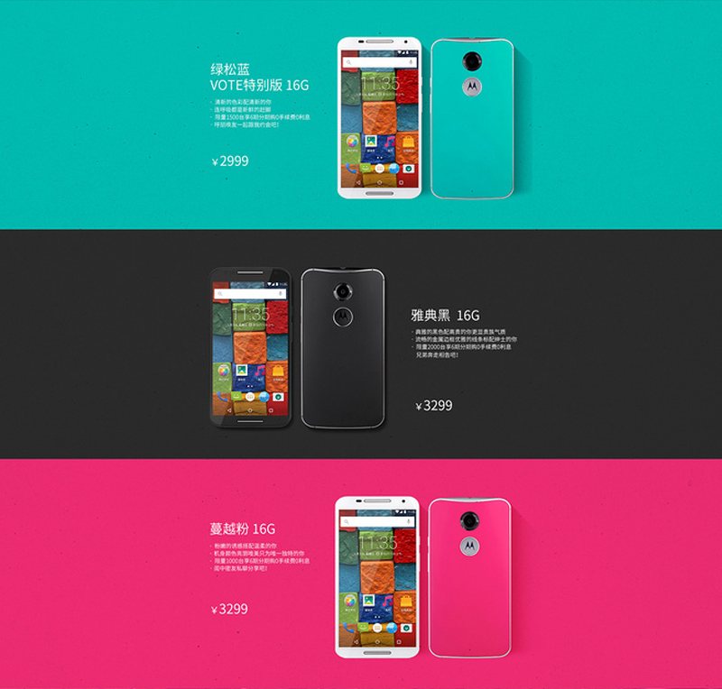 上面的圖是Motox的網(wǎng)頁(yè)設(shè)計(jì),頁(yè)面的主色調(diào)(背景色)使用了手機(jī)背殼的顏色,這樣可以強(qiáng)調(diào)商品色彩,給購(gòu)買(mǎi)者留下非常深刻的印象。
