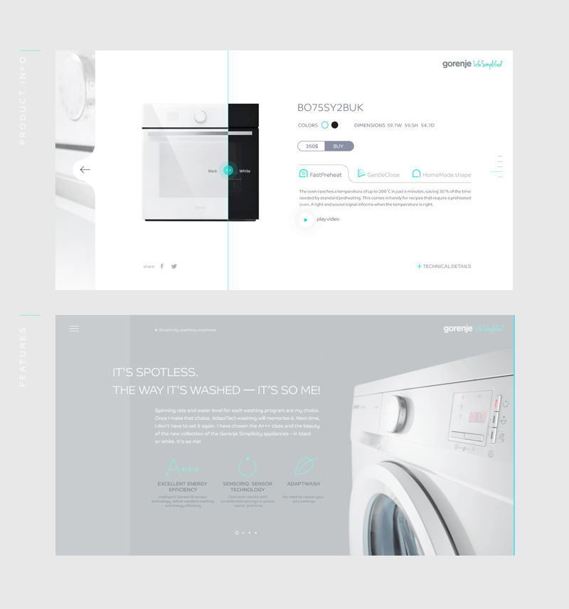 上面的設(shè)計(jì)是小牛N1和一加3的設(shè)計(jì),這兩個(gè)設(shè)計(jì)是典型的左右排版。右側(cè)放商品圖片,左側(cè)排列簡(jiǎn)單而有用的基本文案信息。而左右兩邊的圖片和文案信息的大小對(duì)比要根據(jù)商品的屬性來(lái)決定的。例如,一加手機(jī)主要體現(xiàn)手機(jī)的外型和質(zhì)感,所以放置2個(gè)占比面積較大的手機(jī),搭配基本的文案信息(只有手機(jī)名字、價(jià)格和購(gòu)買(mǎi)按鈕)。