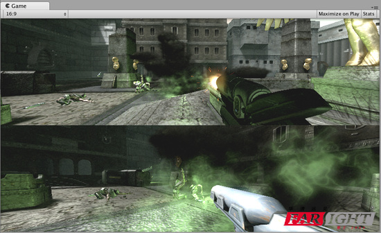 Viewport Rect可以很容易地創(chuàng)建雙玩家(two-player)的分割畫(huà)面效果。創(chuàng)建了兩個(gè)攝像頭后,改變兩個(gè)相機(jī)的H值為0.5然后設(shè)置玩家1的Y值至0.5,玩家2的Y值設(shè)置為0。那么玩家1的攝像機(jī)就會(huì)從屏幕的中間到頂部顯示,玩家2的攝像機(jī)就會(huì)從屏幕底部到屏幕中間顯示(把屏幕按上下分成2半,上半部分是玩家1的,下半部分是玩家2的)