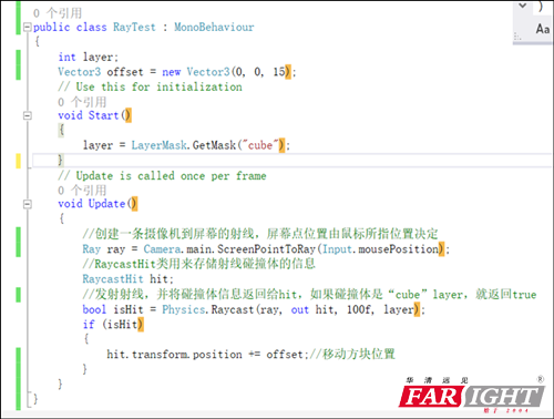 從攝像機發(fā)射一條穿過鼠標在屏幕位置的射線,當“cube”層的游戲對象碰撞到射線,對碰撞體進行平移: