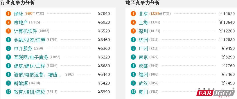 備注:本行業(yè)競爭力數(shù)據(jù)僅代表南京前端開發(fā)工程師情況,并非全國數(shù)據(jù)。數(shù)據(jù)顯示:南京前端開發(fā)工程師在“保險”行業(yè)工資高,為¥7040;在“北京”地區(qū)工資高,為¥14620。